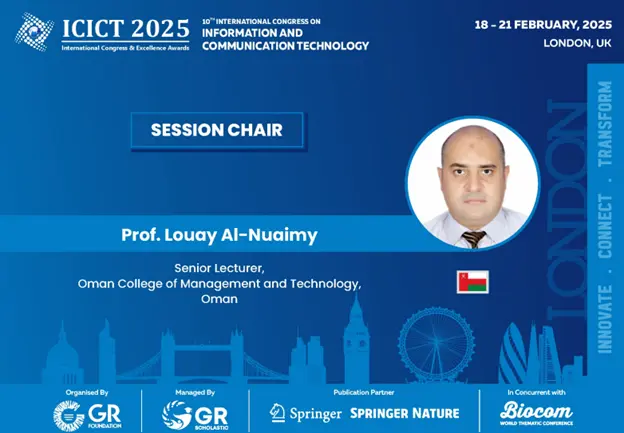 تفخر كلية عمان للإدارة والتكنولوجيا (OCMT) بالإعلان عن نجاح الأستاذ لؤي النعيمي، عضو هيئة التدريس المتميز، في تمثيل الكلية كرئيس للجلسة الفنية في المؤتمر الدولي العاشر لتكنولوجيا المعلومات والاتصالات (ICICT 2025). يعد هذا المؤتمر، الذي ترعاه Springer وتنظمه مؤسسة المعرفة العالمية للأبحاث (Global Knowledge Research Foundation)، منصة مرموقة تجمع نخبة من الباحثين والخبراء لمناقشة أحدث التطورات في مجال تكنولوجيا المعلومات والاتصالات.