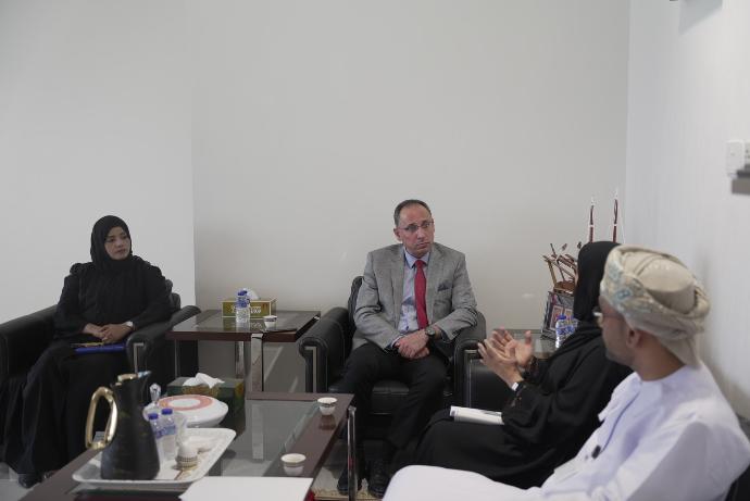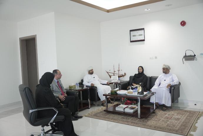 In the context of the college's keenness to enhance cooperation and partnership with the government sector, the acting dean of the college, Dr. Hazem Migdady, received the delegation of the Ministry of Labor, which included Ms. Nasra bint Nasser Al-Jabriya, Assistant General Director for Human Resources Development, and Dr. Muhammad bin Salem Al-Hudaifi, Assistant General Director of the Training and Manpower Development Department, and Mr. Abdul Rahman bin Omar Al Qasimi, Training Program Follow-up Specialist. Where the meeting focused on discussing prospects for cooperation between the Ministry and the College, through the preparation and implementation of training programs for workers in the administrative sector. In addition to training people with special needs, to enable them and enhance their opportunities to engage in society effectively. The meeting also discussed the possibility of facilitating opportunities for completing studies for public sector employees and ministry employees within the College. In this context, the Acting Dean of the College welcomed this initiative on the part of the Ministry and stressed the College's desire to sign a cooperation agreement that regulates prospects for joint work in the coming days.