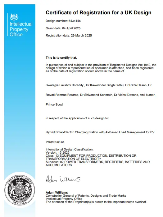 Co-developed with a team of international researchers, Dr. Dattana’s innovative design integrates solar and electric energy sources with artificial intelligence to manage energy loads at electric vehicle (EV) charging stations. The system is engineered to reduce energy waste, optimize energy distribution, and promote sustainable urban transportation.