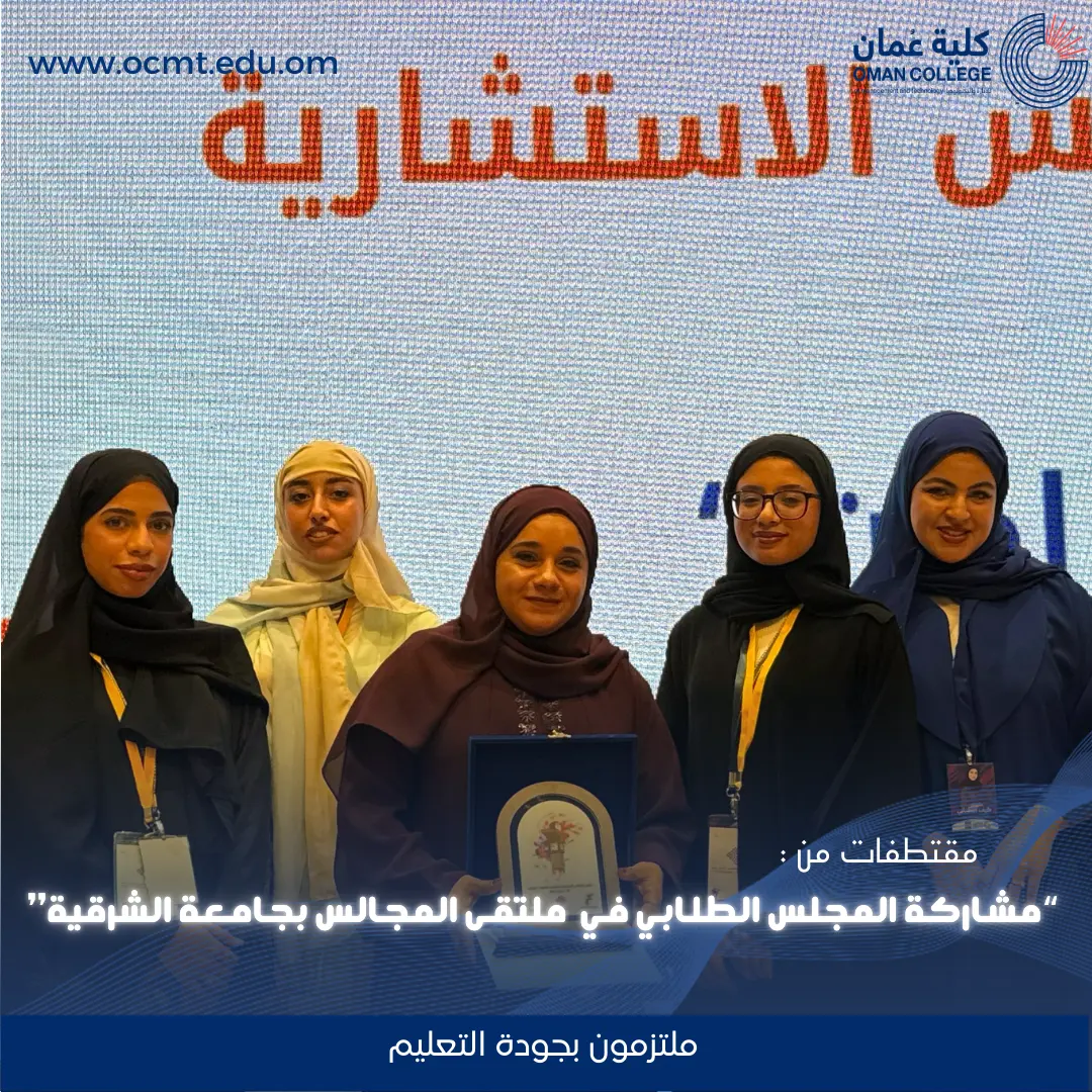 Organized by the University of Sharqiyah, and as part of the Cultural Week activities, the college participated in the Student Councils Forum on February 24, 2025, represented by four members of the student council.