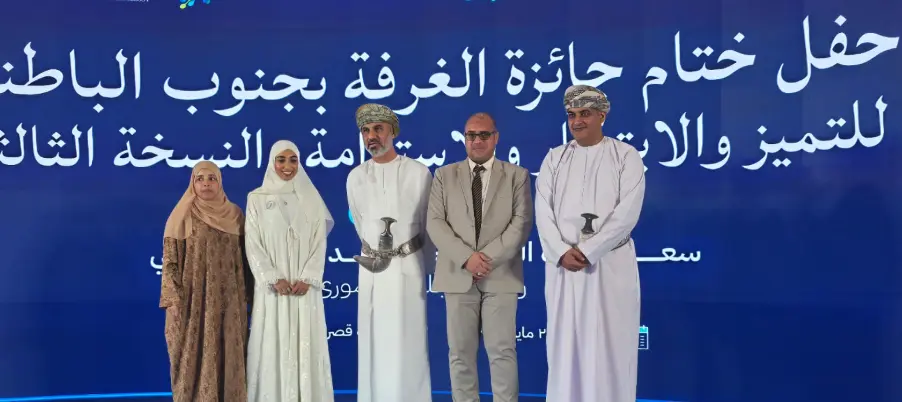 In a distinguished celebratory atmosphere held in the Wilayat of Barka, South Al Batinah Governorate, on Tuesday, May 20, 2025, Oman College of Management and Technology (OCMT) participated in the closing ceremony of the 3rd edition of the South Al Batinah Chamber of Commerce and Industry Award for Excellence, Innovation, and Sustainability, organized by the Chamber's local branch. The event was held under the patronage of H.E. Sheikh Khalid bin Hilal Al-Maawali, Chairman of the Shura Council, with the honored presence of H.E. Eng. Masoud bin Saeed Al-Hashmi, Governor of South Al Batinah, and Eng. Hamoud bin Salim Al-Saadi, Second Deputy Chairman of the Chamber and Chairman of the Chamber’s South Al Batinah branch, alongside a distinguished group of officials, private sector representatives, and higher education institutions. This year’s edition of the award aimed to reinforce institutional excellence, encourage student innovation, and support national sustainability goals across various sectors. The award categories were expanded to include small and medium enterprises (SMEs), industrial and tourism companies, in addition to student companies from universities, colleges, and schools. OCMT made a prominent and honorable presence through the participation of two student-led companies, “Ewan” and “EnviroSense”, both presenting pioneering ideas that reflect the spirit of innovation and entrepreneurial ambition among the college’s students. Crowning this participation, “EnviroSense” secured second place in the Student Companies – Higher Education category, marking a significant achievement for the college. The company’s idea focuses on developing a smart device utilizing Internet of Things (IoT) technology to monitor air quality and accurately detect pollutants, thereby contributing to environmental sustainability and public health by providing real-time data that supports informed decision-making. The second participating company, “Ewan,” presented a project aimed at connecting students with reliable digital platforms that offer safe and suitable accommodation options near their academic institutions—addressing a real and growing need in student life. This remarkable performance reflects OCMT’s unwavering commitment to fostering innovation and entrepreneurship among its students. By supporting meaningful student-led projects, the college seeks to enhance graduate readiness, provide real-world experiences, and contribute to a productive, sustainable, and knowledge-based society in line with Oman Vision 2040. The event also included a visual presentation outlining the evaluation process of all participating companies and concluded with honoring the winners and assessment committee members. In his speech, Eng. Hamoud Al-Saadi expressed pride in the national talents showcased, emphasizing that innovation remains a cornerstone for building a bright future.