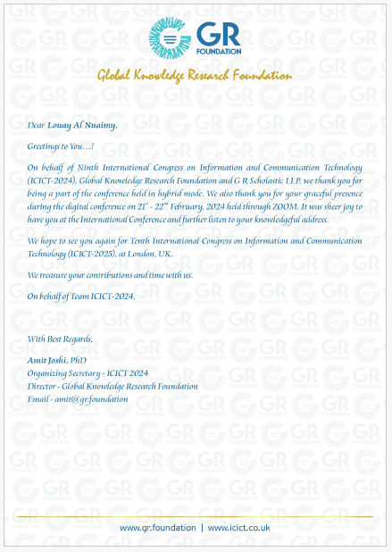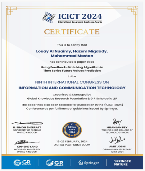 A research team from the Oman College of Management and Technology has developed an innovative and unprecedented algorithm for predicting future values in time series, entitled “Feedback Matching Algorithm for Predicting Future Values of Time Series.” The research team consisted of researchers in the Department of Computer Science and Management Information Systems, and they are: Dr. Hazem Migdady (Associate Professor), Mr. Louay Al-Nuaimi, and Dr. Mustan Muhammad (Assistant Professor). The algorithm was announced through participation at the 9th International Conference on Information and Communications Technology (ICICT 2024), held from February 19 to 22, 2024 at the America Square Convention Center in London, United Kingdom.