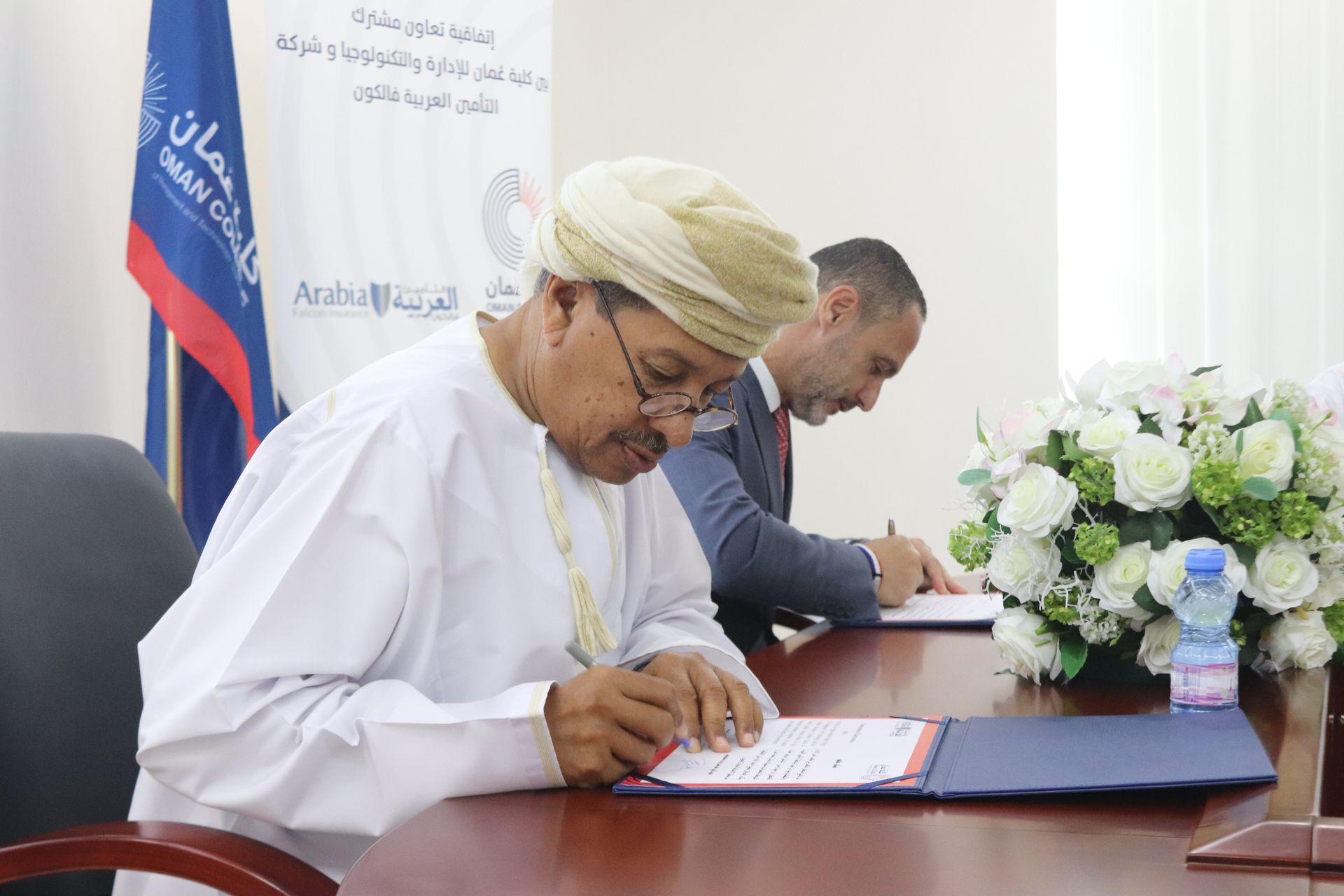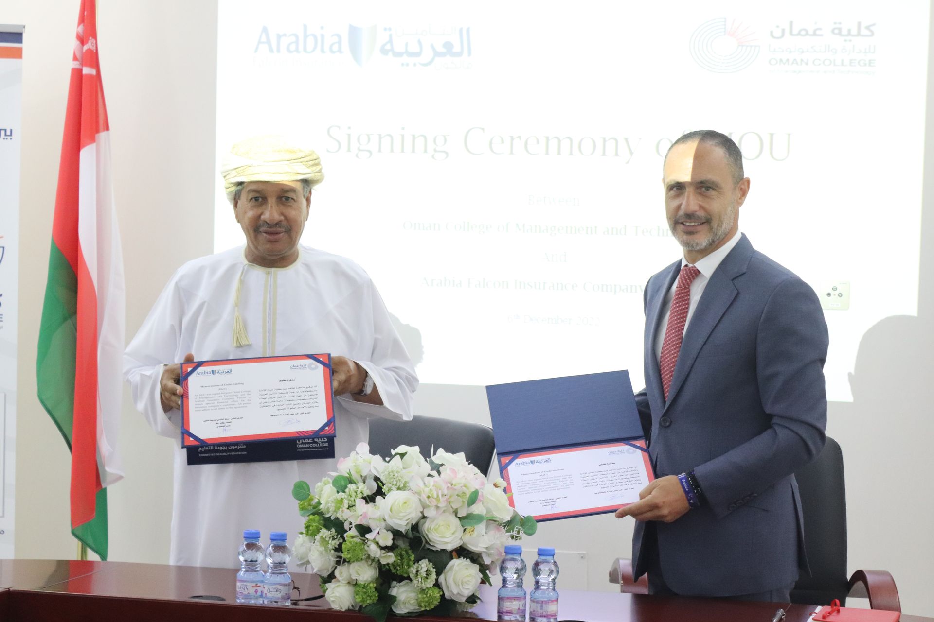 Oman College of Management and Technology signed an MoU with the Arabia Falcon Insurance Company, as this MoU contributes to expanding the horizons of cooperation and enhancing opportunities for employees of the two institutions. Where this agreement enables both sides to benefit from the advantages and resources that each of them enjoys. Under the agreement, the college will be committed to organizing vocational and professional courses to train the insurance company's staff and enhance their skills in a scientific and systematic manner. The college will also provide financial facilities for the insurance company's clients who wish to study at the college. For its part, the Arabia Falcon Insurance Company will strengthen the college's marketing efforts, and will provide training opportunities for graduate students in order to contribute to providing them with some of the necessary skills to meet the needs and expectations of the industry.